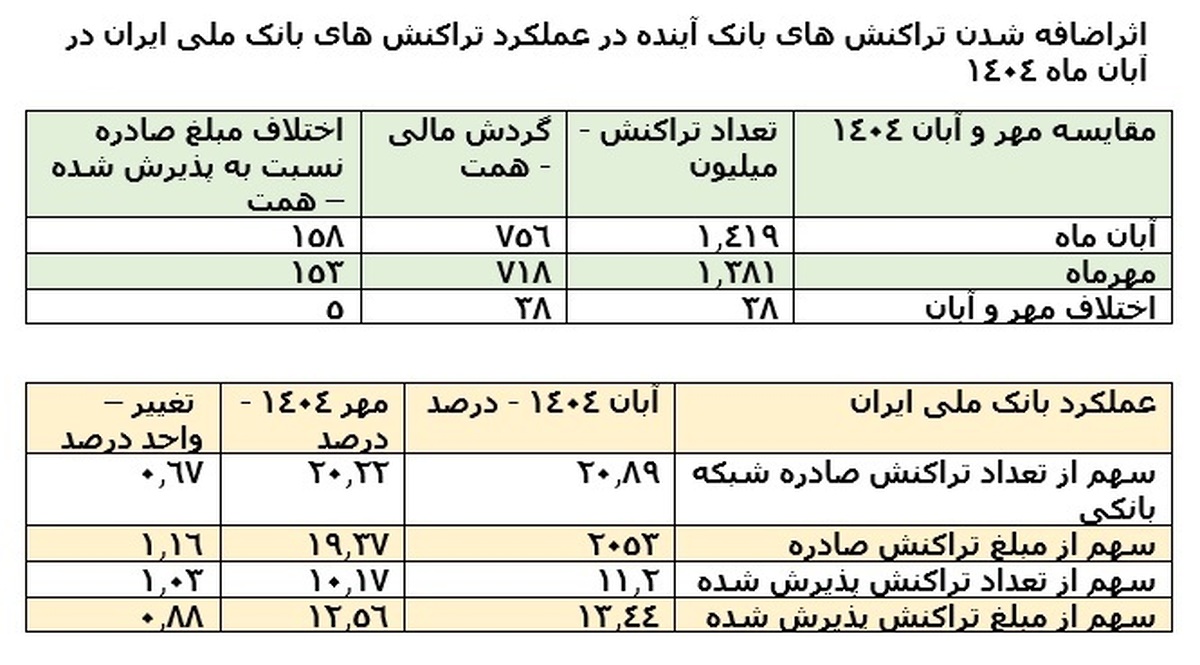اثراضافه شدن تراکنش های بانک آینده در عملکرد تراکنش های بانک ملی ایران در آبان ماه 1404