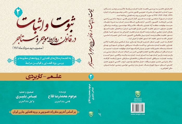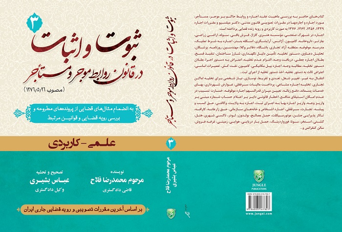 كتاب سه جلدي ثبوت و اثبات در قانون روابط موجر و مستاجر نوشته محمد رضا فلاح قاضي دادگستري كه توسط عباس بشيري وكيل دادگستري و نويسنده بيش از 46 جلد كتاب حقوق كاربردي تصحيح شده، توسط انتشارات جنگل منتشر شد