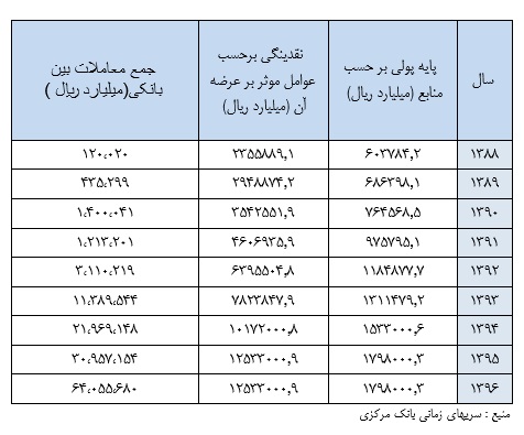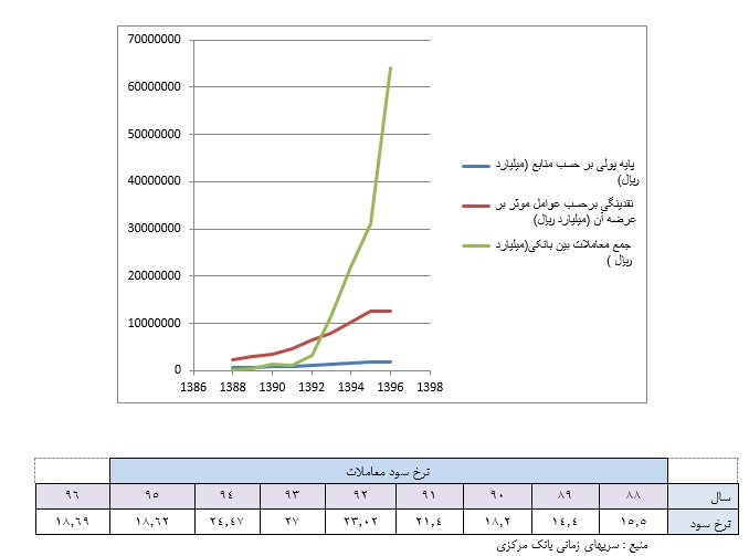 براساس این اطلاعات، حجم معاملات بینبانکی از سال 88 تا 96 و در یک دوره 9 ساله به میزان 534 برابر افزایش یافته است درحالی که رشد پایه پولی 3.3برابر و رشد نقدینگی 7برابر شده است. در کمال تعجب مشاهده میشود که رشد حجم معاملات بانکی به شکل جنونآمیز، 160برابر رشد پایه پولی و بیش از 76برابر رشد نقدینگی بوده است. همچنین رشد ضریب فزاینده از 3.9 در سال 88 به 7.2 در سال 96 نشاندهنده اثر معاملات بینبانکی بر خلق نقدینگی است.