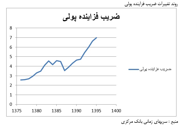 در سالهای 1375 تا 1397 در طرف چپ معادله فیشر، میزان پایه پولی از رقم 5 هزار میلیارد تومان به بالای 200هزار میلیارد تومان رسیده و 40برابر شده است. نقدینگی از 13 هزار میلیارد تومان به 1600 هزار میلیارد تومان رسیده و 120برابر شده است. ضریب فزاینده یا سرعت گردش پول از 2.5 به 7.2 رسیده و تقریبا سه برابر شده است.