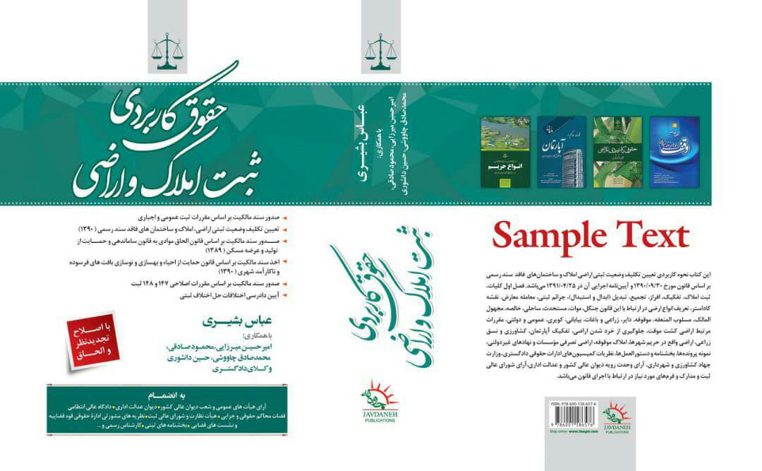در اين زمينه، كتاب حقوق كاربردي ثبت املاك و اراضي در سال 1398 و توسط انتشارات جنگل منتشر شد. اين كتاب كه تاليف عباس بشيري حقوق دان و وكيل پايه يك دادگستري با تيم همكاران اوست به تفصیل به تمام ثبت های اراضی و املاک و آب اشاره كرده است.