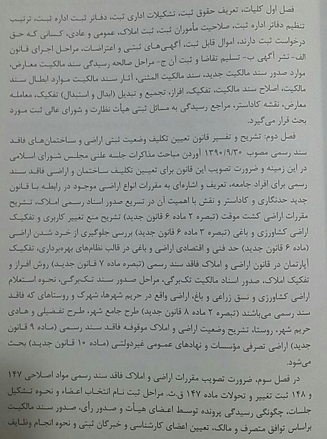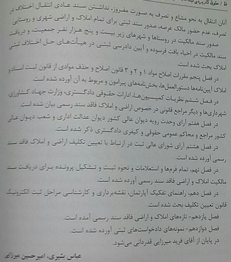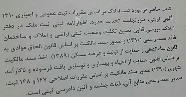 در اين كتاب آمده كه بعد از مصوبات و قانون 1310 كه امكان اعتراض از اشخاص نسبت به صدور سند مالكيت پذيرفته نخواهد بود. درسال 1365، مواد147 و148 اصلاحی ثبت اضافه شدكه تا سال 1383 مبناي عمده اي براي ثبت و سند بوده است.