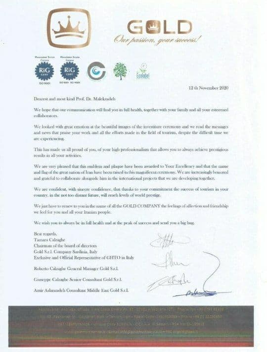 اساتید صاحب نام دانشگاه‌ها و مراکز گردشگری مهم دنیا همچون کاخا شنگیلیا IAPU  ،اقای غلام عباس بزرگی و خانم زهرا برزگر، دکتر جانی هاریانتو از دانشگاه پریزیدنت اندونزی، دکتر تاکشی ماستورا رئیس دانشگاه کیوتو ژاپن، دکتر الهام مدمدوف از دانشگاه گردشگری و مدیریت آذربایجان، دکتر شان چن از دانشگاه SIAS چین، دکتر کورنی دیج مانی مدیر پژوهش و نوآوری دانشگاه علمی و کاربردی هلن، خوزه کاستا رئیس دانشکده توسعه و برنامه ریزی گردشگری پرتغال، پروفسور دانیل فسن مایر از انستیتو گردشگری، اریک فیدمن دانشگاه فلوریدا آمریکا، دکتر فارگاس سانچز استاد تمام دانشگاه هولوا اسپانیا و پروفسور کای چون رئیس دانشکده مدیریت هتلداری و گردشگری دانشگاه پلی تکنیک هنگ کنگ پیام تبریک خود را به پروفسور ایرانی برای دریافت اولین جایزه و اختراع در صنعت گردشگری و کسب عنوان «پروفسور و پدر علم نوين گردشگري جهان» اعلام کردند.