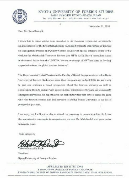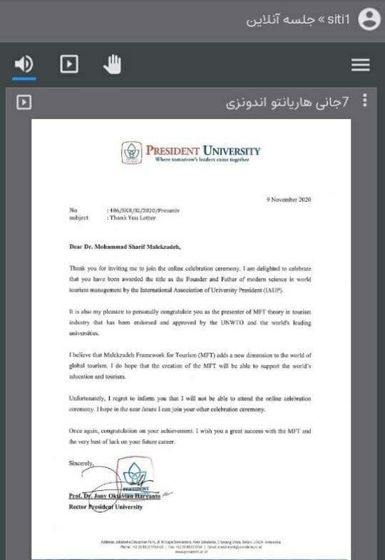 این آیین که روز 26 آبان‌ماه در کیش برگزار شد به گونه‌ای برنامه‌ریزی شده بود‌‌ که همه اساتید‌‌ و محققان جهان این روید‌‌اد‌‌ را د‌‌ر د‌‌انشگاه‌ها و مراکز تحقیقاتی خود‌‌ به صورت آنلاین مشاهد‌‌ه کردند. در همین راستا انستیتو گردشگری بوگوتا در کلمبیا از پروفسور ملک‌زاده برای تدریس تئوری MFT برای دوره‌های فوق‌لیسانس دعوت کرده تا آنها بتوانند ابزارهای جدیدی را بر اساس این تئوری جالب بدست آورند که با درک بهتری در این پروژه  فوق‌العاده مشارکت داشته باشند. به عنوان مقدمه همین همکاری خانم کارول مارینو، مدیرکل انستیتو گردشگری بوگوتا با حضور در مراسم تجلیل از جایگاه علمی دکتر ملک‌زاده، کسب عنوان پدر علم نوین مدیریت گردشگری را تبریک گفت و تصریح کرد « ما در کلمبیا بر این باوریم که صنعت گردشگری باید محتوی وسیعی از نوآوری و خلاقیت داشته باشد تا گردشگران و مردم نه تنها مقاصد و خدمات متنوع را تجربه نمایند، بلکه حس فرهنگی، جوامع محلی، احساسات و خاطراتی را لمس و در یک محیط لذت بخش در طول سفر زندگی کنند. بنابراین ،  فرصت جدیدی فراهم شده است تا ضمن هم افزایی و تبادل دانش بر اساس مطالعات در زمینه گردشگری و لحاظ کردن سناریوهای جدید که در نتیجه شیوع کرونا ایجاد شده است، بتوانیم نگرشها و ابزارهای متفاوتی را در پیش بگیریم  تا کشورهای ما به عنوان مقاصد گردشگری پاسخگوی نیازهای خاص و ویژه هر گردشگری باشد.