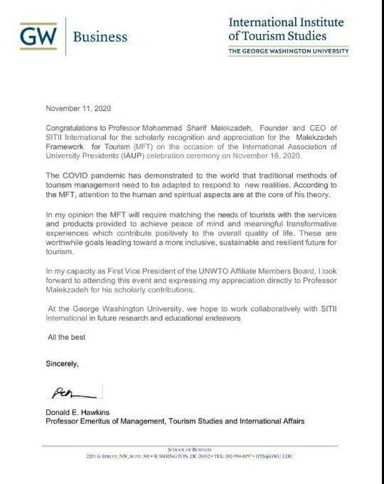 تئوری MFT صنعت گردشگری جهان را به دنیای نوینی برده است بر همین اساس پروفسور دونالد هاوکینر، استاد تمام دانشگاه جرج واشنگتن و نایب رییس اعضای وابسته سازمان جهانی جهانگردی (UNWTO)  با حضور در مراسم تجلیل پروفسور محمدشریف ملک‌زاده ،ضمن پیام تبریک و تجلیل، تاکید کرد که دانشگاه جرج واشنگتن آمادگی کامل برای همکاری آموزشی و پژوهشی با سازمان بین‌المللی سیتی وان را دارد.