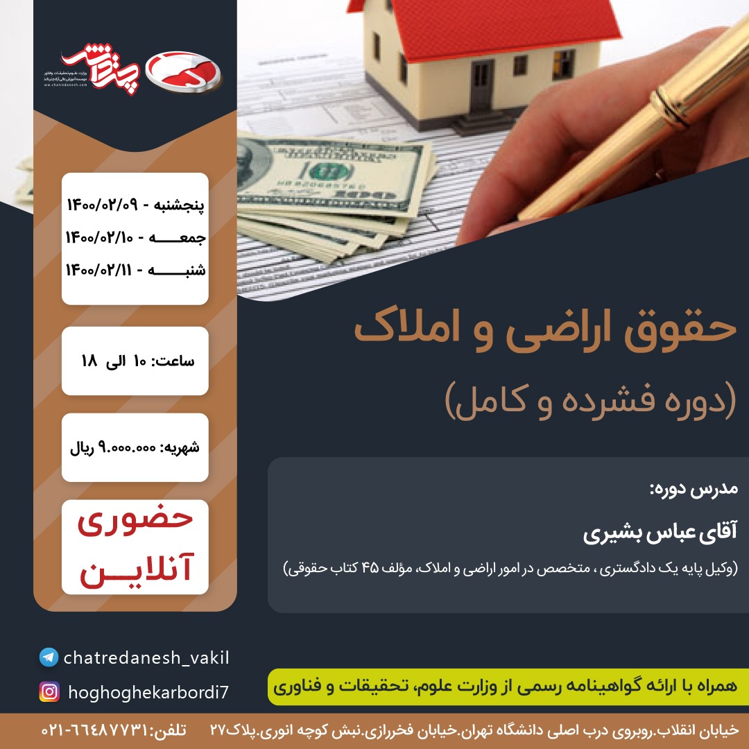 کارگاه حقوق اراضی و املاک توسط موسسه چتر دانش برگزار می شود. مدرس این دوره عباس بشیری نویسنده بیش از 50 جلد کتاب های حقوق کاربردی است