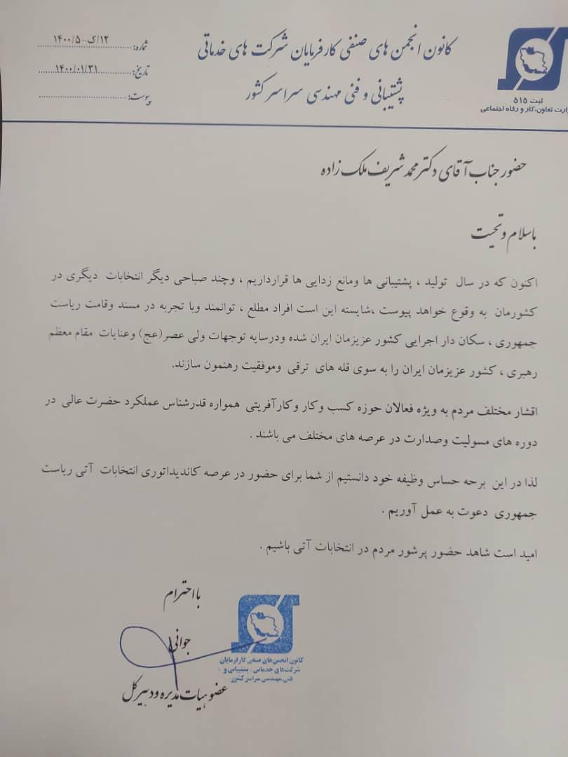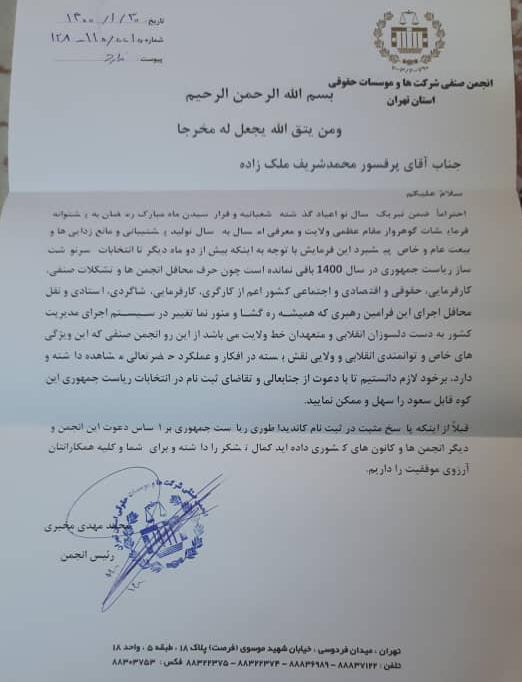 همزمان با روز جهانی کارگر در 11 اردیبهشت ماه، تشکل های کارگری در نامه ای با دعوت از محمدشریف ملک زاده، معاون رئیس جمهور اسبق و رئیس سازمان میراث فرهنگی، صنایع دستی و گردشگری دولت احمدی نژاد، خواستار حضور او در انتخابات 1400 شدند.