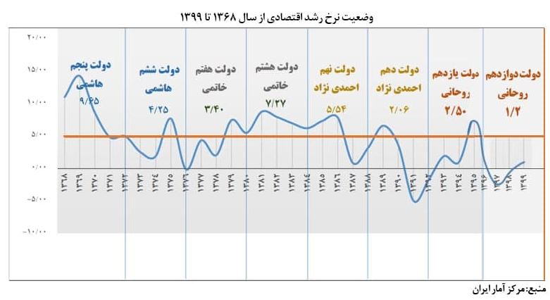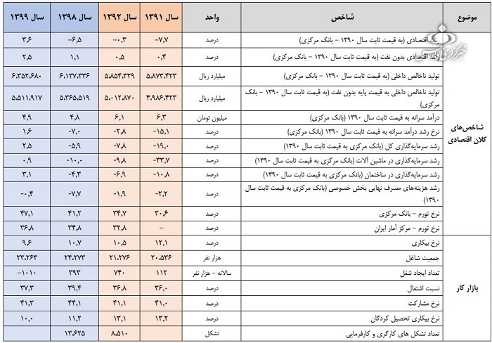 رشد اقتصادی سال های 91 و 92 معادل 7.7- و 0.3- درصد و در سا لهای 98و 99 معادل 6.5- و 3.6 درصد بوده است. درآمد سرانه در دو سال قبل از دولت روحانی معادل 6.3 و 6.1 میلیون بوده و در دو سال آخر دولت روحانی به 4.8 و 4.9 میلیون تومان رسیده ونشان دهنده کاهش قدرت خرید مردم و درآمد خانوار است که با تورم موجود به معنای کاهش زیاد در مخارج مصرفی بخش خصوصی و مردم و خانوارهاست.