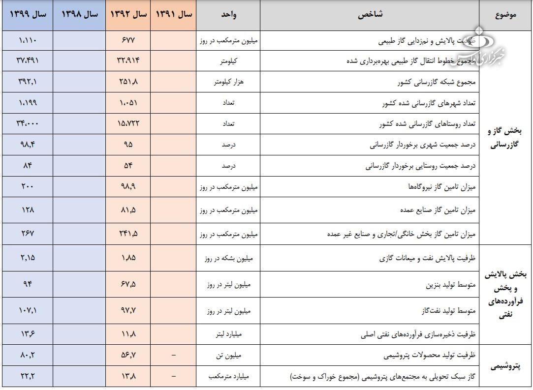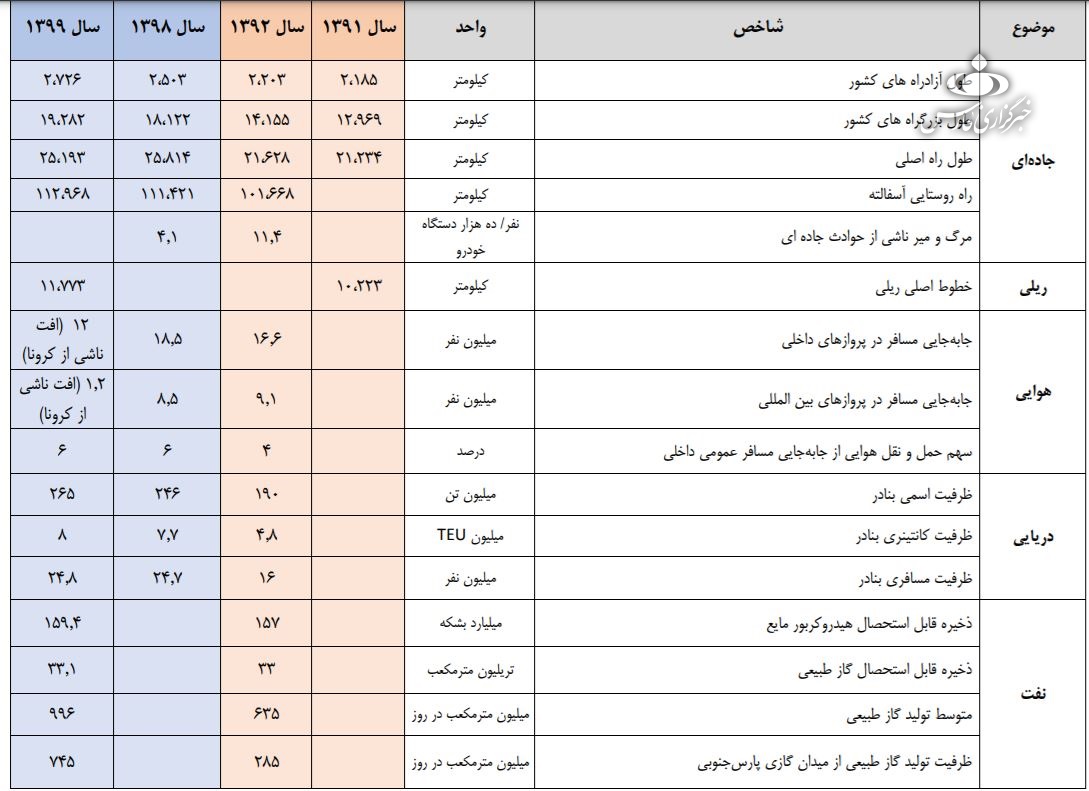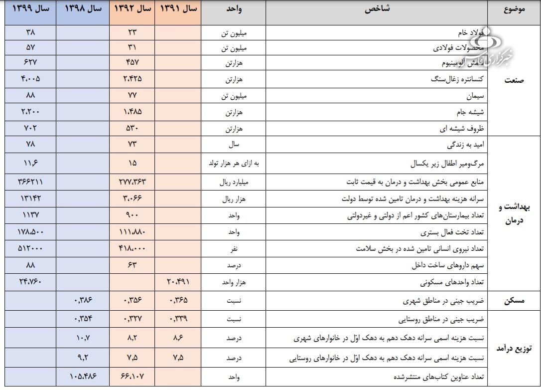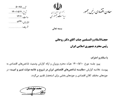 محمد نهاوندیان معاون اقتصادی دولت دوازدهم آخرین گزارش تغییر و تحولات شاخص های اقتصادی و حوزه های بخشی را به صورت مقایسه شروع به کار و پایان کار دولت در تاریخ 11 مرداد ماه سال جاری به حسن رئیس جمهور سابق ارائه کرد. شاخص های کلان اقتصادی و حوزه های بخشی را به همراه جدول مقایسه سال 91، 92، 98 و 99 ارائه شده است