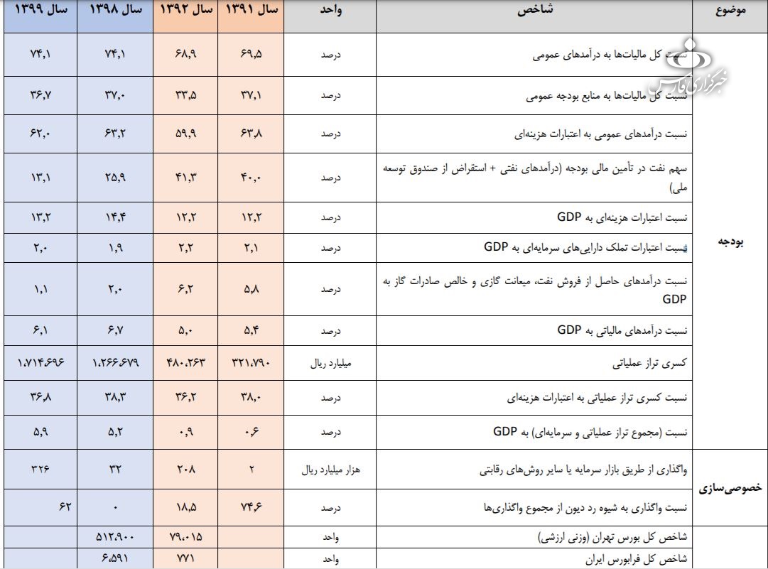 سهم نفت در تامین بودجه نیز در دو سال 91 و 92 معادل 40 و 41 درصد بوده که در دو سال 98 و 99 به 25 و 13 درصد رسیده است.