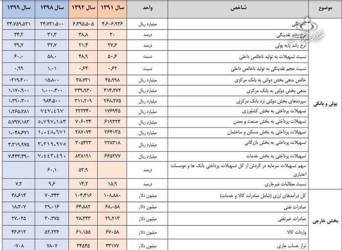 طبق گزارش معاون اقتصادی رئیس جمهور سابق «نقدینگی 639 هزار میلیارد تومانی در سال 92 به بیش از 3475 هزار میلیارد تومان در سال 99 رسید که نرخ رشد 34.2 درصدی داشته است. پایه پولی نیز در سال گذشته 39.7 درصد رشد کرد که در سال 92 بالغ بر 21.4 درصد بود.»