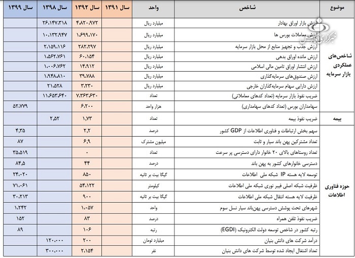 در این بخش به شاخص های عملکردی بازار سرمایه پرداخته شده است که به ارزش بازار و معاملات، ارزش جذب و تجهیز منابع ، مانده ارواق بدهی، انتشار اوراق اسلامی و سایر مباحث اختصاص یافت.آمارهای بازار بورس در سال 99 از سوی مراجع متولی ارائه نشده و ارقام آن در جدول خالی است که امکان مقایسه را سلب کرده است. البته با توجه به تحولات نرخ ارز در سال های اخیر اوضاع بازار سرمایه نسبت به سال 92 مناسب بوده است.