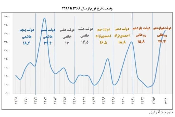 نرخ تورم دو سال 91 و 92 معادل 30.6 و 34.7 درصد بوده که در دو سال 98 و 99 به 41.2 . 47.1 درصد رسیده است.