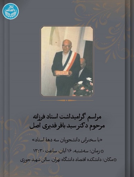 اقتصاد گردان - مراسم گراميداشت شادروان دکتر باقر قدیری در دانشکده اقتصاد دانشگاه تهران روز سه شنبه ١٦ آبان 1402 از ساعت 1.30 تا 3.30 در سالن شهید جوزی برگزار شد.