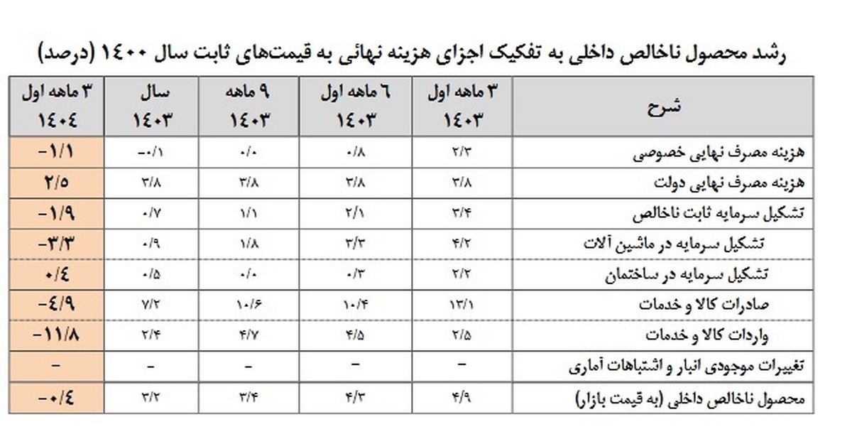 هزینه مصرف نهایی بخش دولتی نیز در سال 1403 معادل 3.8 درصد و در سه ماه اول 1404 معادل 2.5 درصد اعلام شده است.