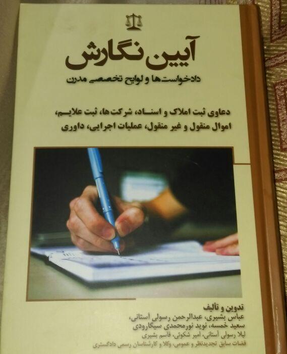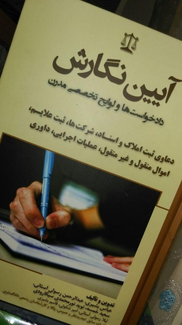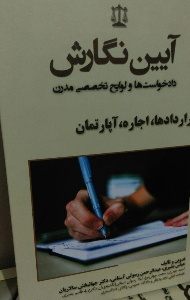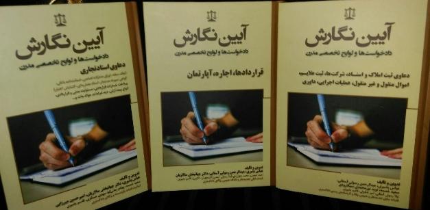 كتاب سه جلدي آيين نگارش دادخواست ها و لوايح تخصصي مدرن در ارتباط با 1- قراردادها، اجاره و آپارتمان 2- دعاوي ثبت املاك و اسناد، شركت ها، ثبت علائم، اموال منقول و غير منقول، عمليات اجرايي، داوري 3- دعاوي اسناد تجارتي شامل ضمانت نامه بانكي، چك، سفته، اوراق مشاركت تضامني، گواهي سپرده مدت دار، اسناد مضاربه اي، گشايش اعتبار، پرداخت خسارت قراردادي، مسوولين مدني، و قراردادي، انواع بيمه، ديه، حواله جات و... منتشر شد