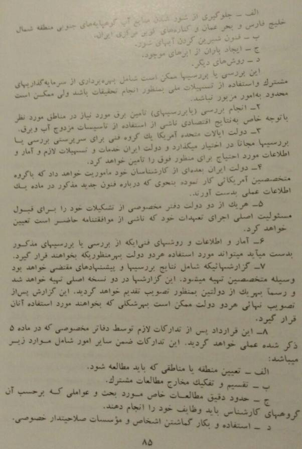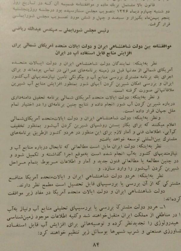 اين موافقت نامه در سال 1346 كه در سه صفحه زير قابل مطالعه است نشان مي دهد كه همكاري بين دولت ها براي شيرين كردن آب و مهار آب ها، ايجاد باران مصنوعي از ابرهاي موجود، جلوگيري از شور شدن آب در مناطق كويري، و بهبود استفاده همواره در طول تاريخ ايران مورد توجه بوده و عضويت ايران در كنفرانس بين المللي سدهاي بزرگ و آبياري و زهكشي در سال 1347 تصويب شده و از آن زمان تاكنون، همواره موضوع آب دغدغه مردم و كارشناسان بوده است...
